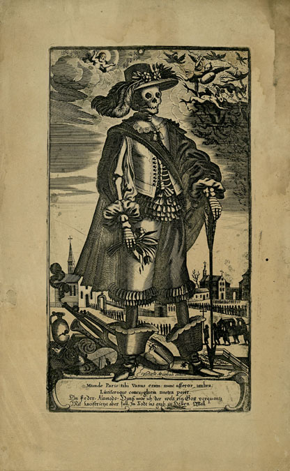 Gerhard Altzenbach, 17th c. Skeleton wearing woman’s fashionable hat and gown, holding bouquet of wilted flowers; church and graveyard in background, Christ enthroned and angels in sky; engraved Latin text.