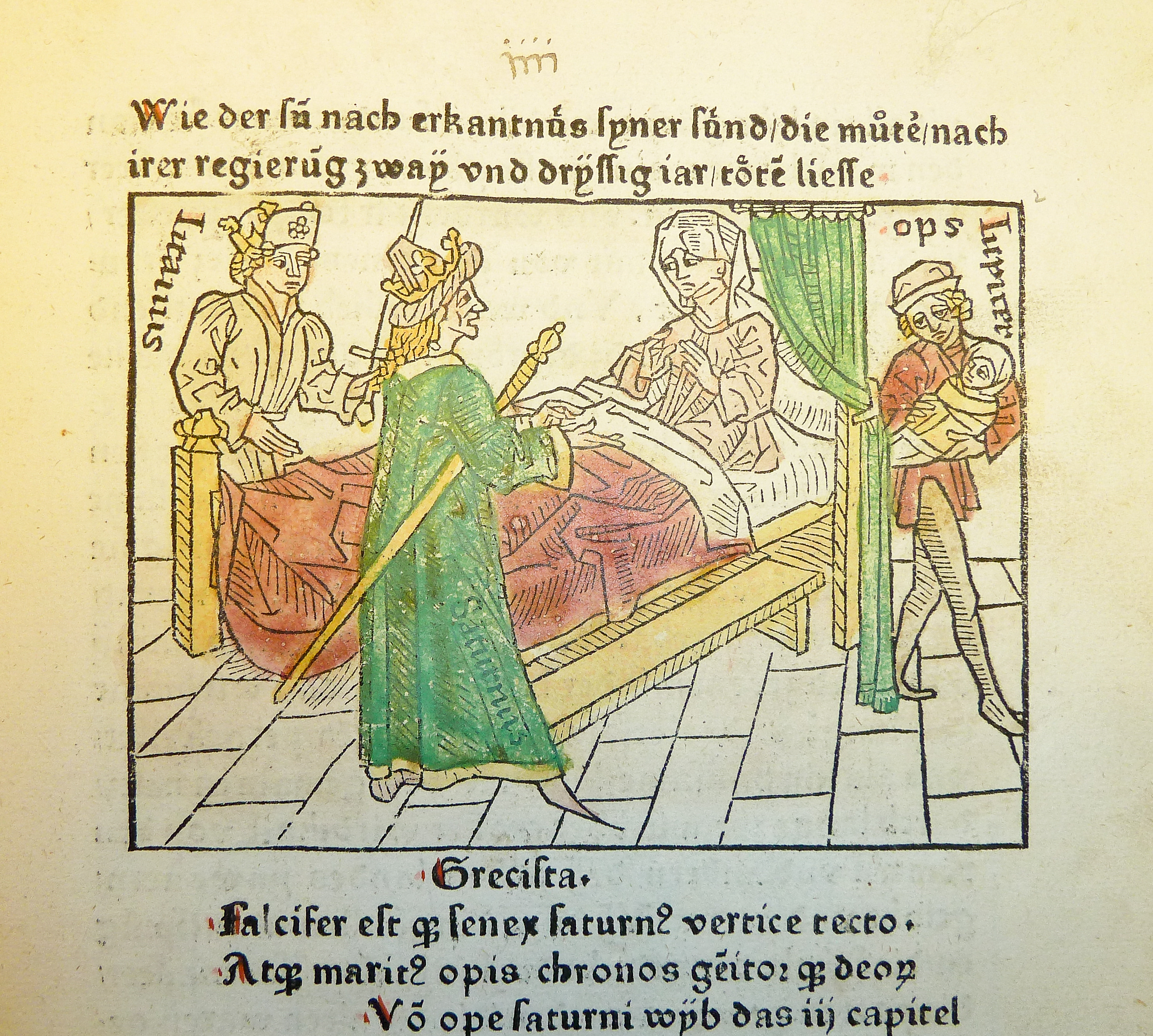 Woodcut illustration of the birth of Jupiter to Ops with Saturnus and Titanus present.
