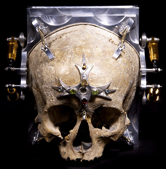 4″x5″ camera made from Aluminium, Titanium, Brass, Silver, Gem Stones and a 150 year old skull of a 13 year old girl. Light and time enters at the third eye, exposing the film in the middle of the skull.
